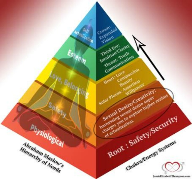 If you take a look at psychologist Abraham Maslow’s theory of the hierarchy of needs and align his model with our seven human energy centers (chakras), the sexual center is located directly above meeting our basic survival needs on the climb to self-actualization. Once we have a roof over our head, food and safety, the next thing we are wired to do is to go out on the prowl. We are hardwired to reproduce and carry on the human race.
